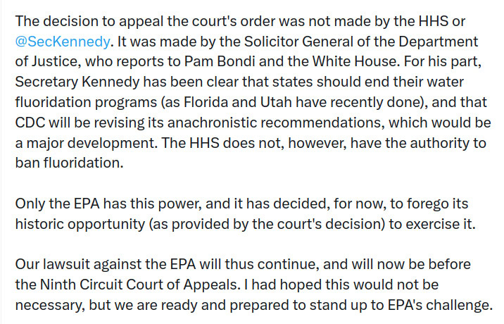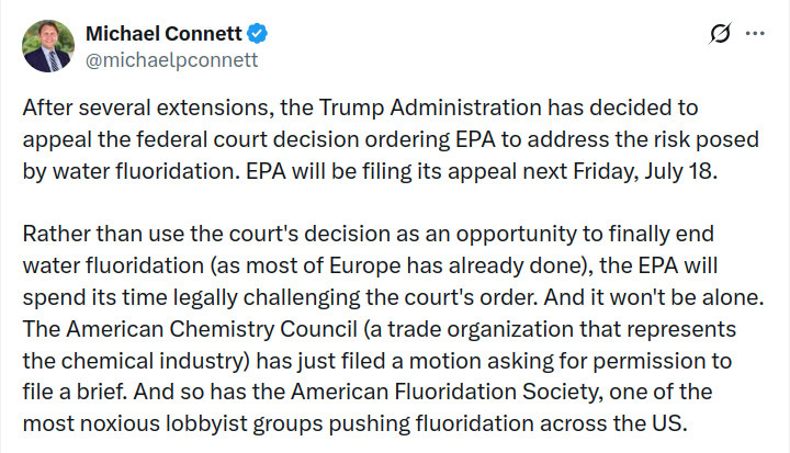 Michael Connett, the lead attorney for the Fluoride Action Network who fought the battle against the EPA under Trump’s 1st admin and Biden’s, posted the following message on his official twitter account.
